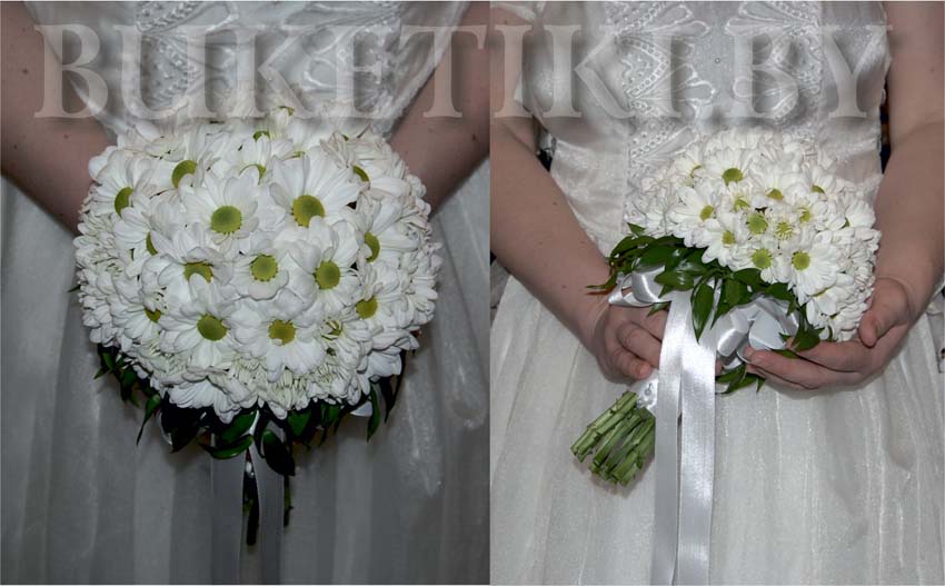 Популярный в этом сезоне букет из ромашек, рускуса сделанный в европейском стиле, с ножками. Драпировка выполнена белой атласной лентой.