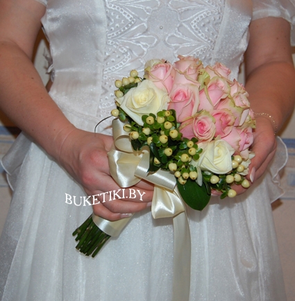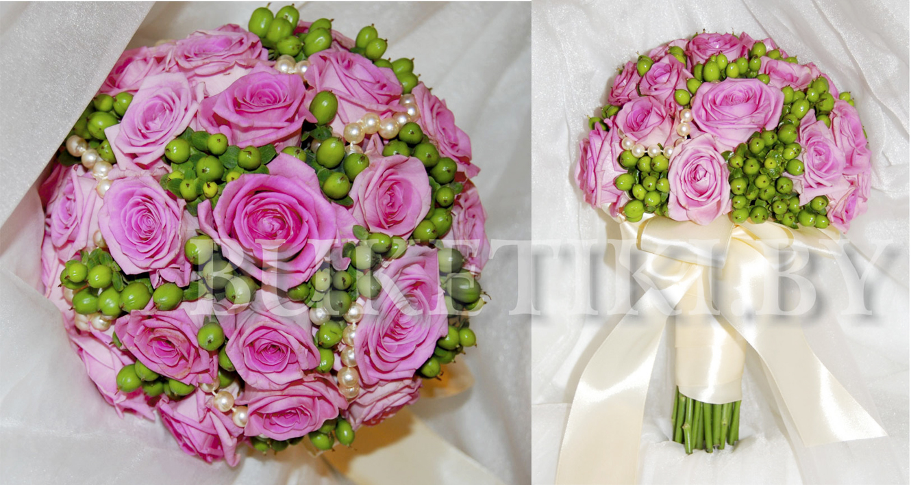 Розовая роза сорта аква, гиперикум зеленого цвета. Драпировка ручки выполнена ножками цветов, перевязка атиласной лентой.