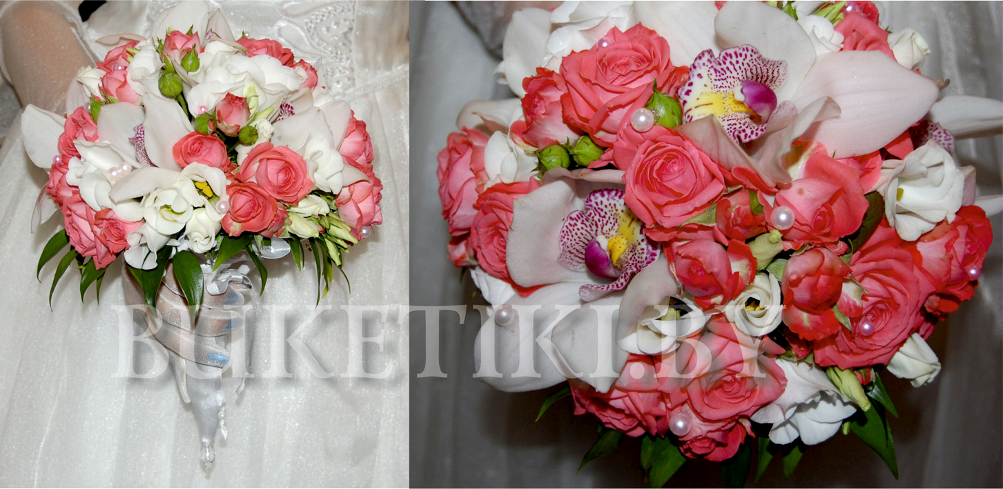 Кустовая розовая роза, белая эустома, орхидея цимбидиум, рускус итальянский. Ручка драпирована кремовой атласной лентой.
