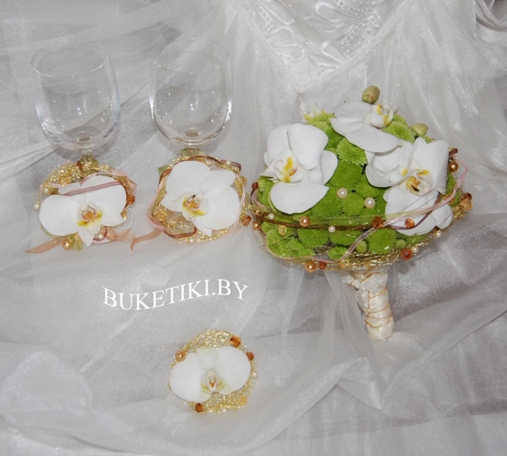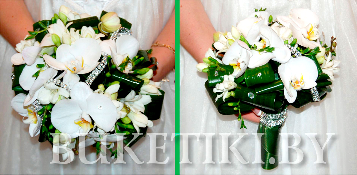 Фрезия, белая орхидея фаленопсис, лист аспедистра, украшен кристаллами. Драпировка выполнена листом аспедистра и кристаллами.