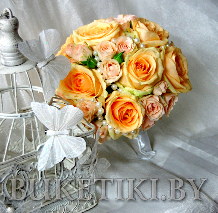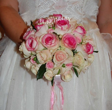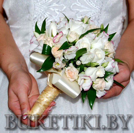 Роза нескольких видов, эустома. зелень, жемчужные бусины. Ручка драпирована атласной лентой.