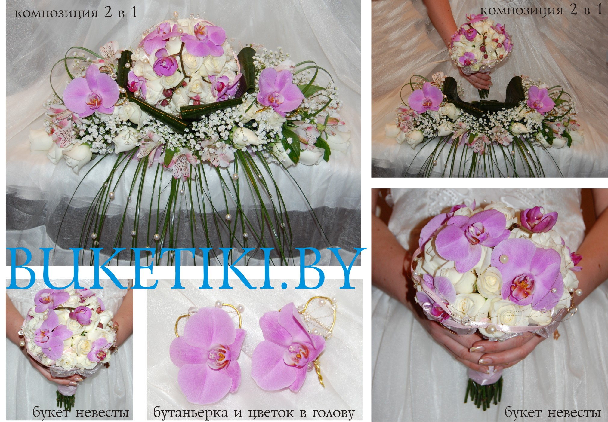 Букет невесты, композиция 2 в 1 на стол молодых, бутаньерка, цветок в прическу, сделанные в едином стиле.