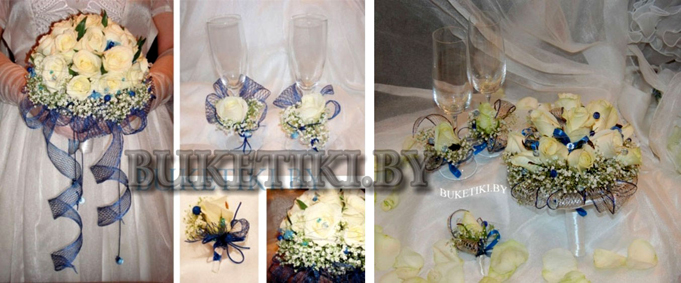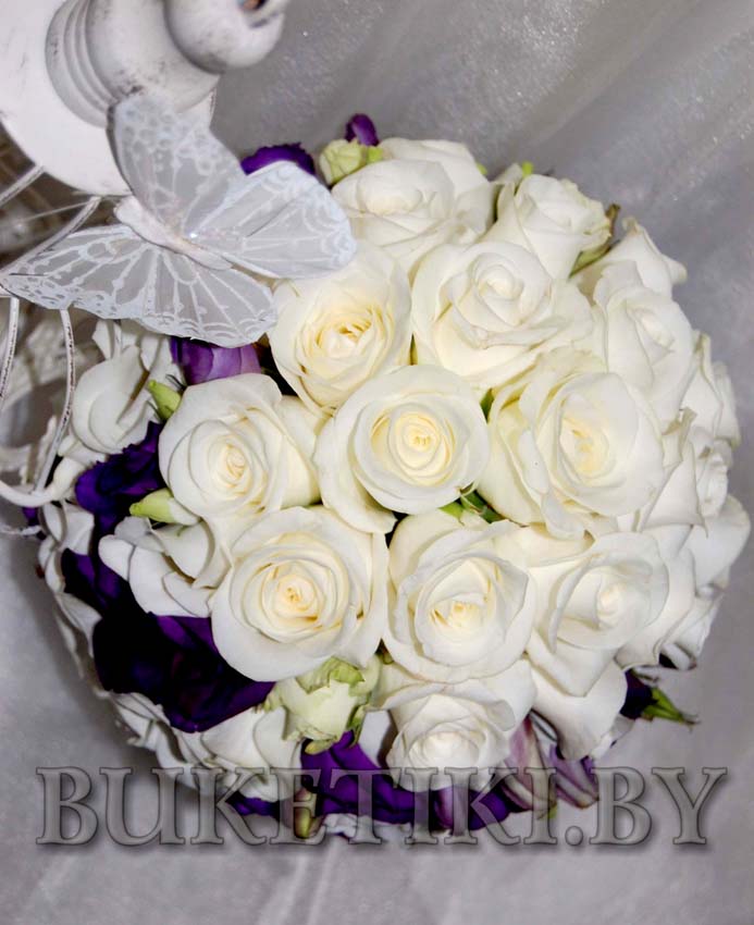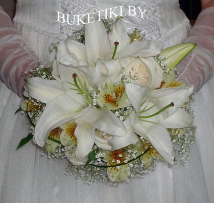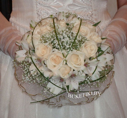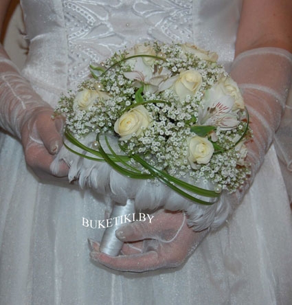Белоснежная лилия, кремовая роза, альстромерия, гипсофила. Драпировка юбки выполнена из белых перьев. Ручка драпирована белой атласной лентой с золотой канвой.