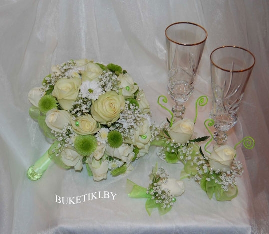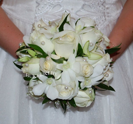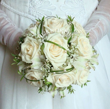 Бело-кремовая роза, белая альстромерия, гипсофила, берграссс, декоративная зелень. Драпировка ручки выполнена атласной лентой и жемчужинами.
