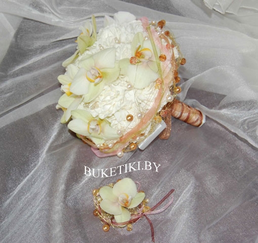 Белая гвоздика, орхидея. Букет оформлен бусинами, лентами различных оттенков.