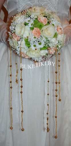 Роза, хризантема разных видов, гипсофила, гвоздика шабо. Драпировка ручки выполнена персиковой атласной лентой, золотой проволокой а также золотыми и белыми бусинами.