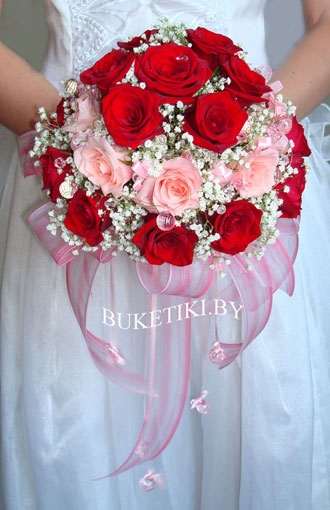 Красная и розовая роза, гипсофила. Драпировка выполнена нежно-розовой лентой и розовыми кристаллами.