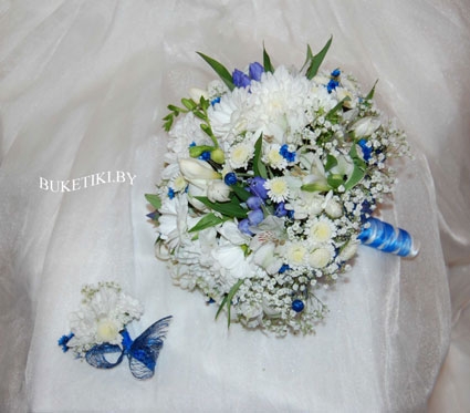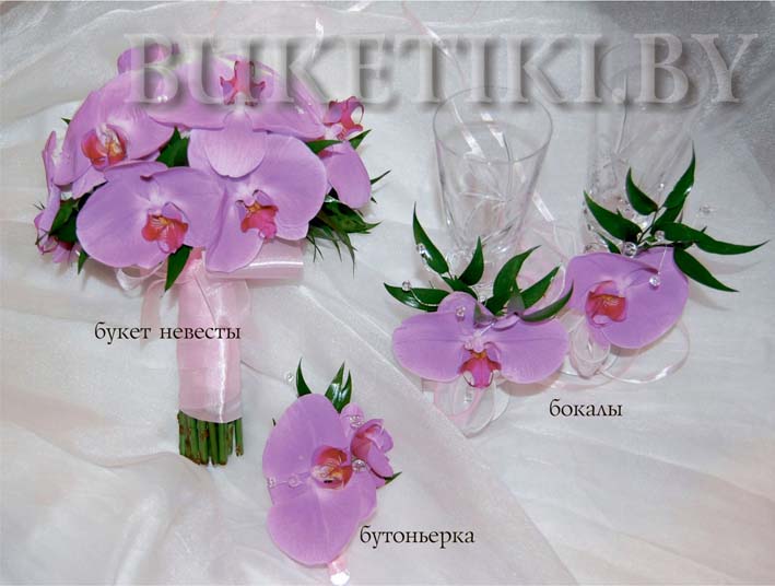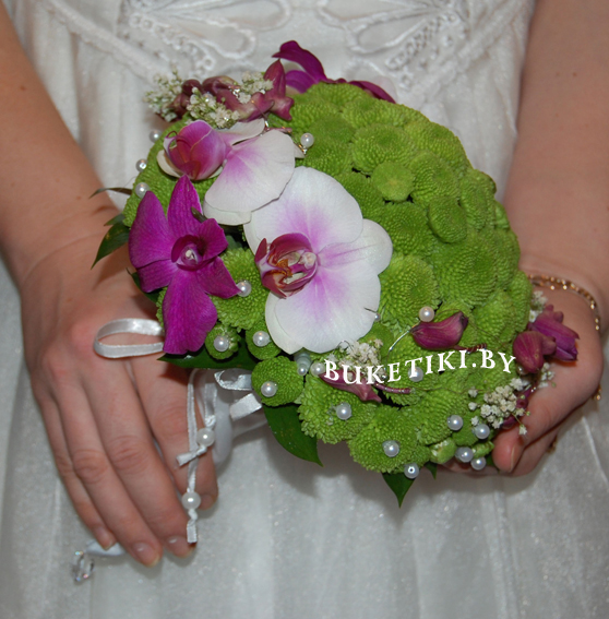 Орхидея дендробиум, орхидея фаленопсис, хризантема, жемчужные бусины, драпировка выполнена атласной лентой. Подробнее об этом букете читайте в блоге.
