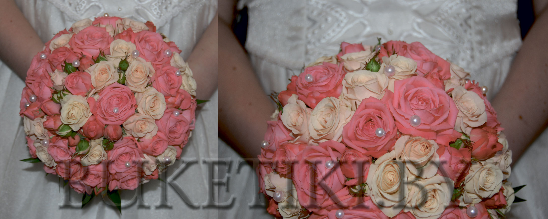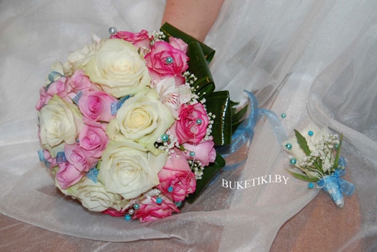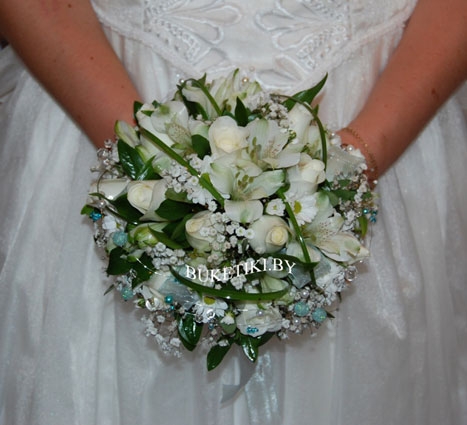 Несколько видов роз, альстромерия, гипсофила, лист аспедистра, зелень, бусины, лента.