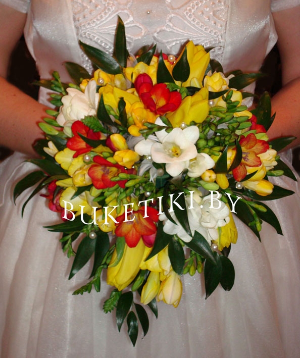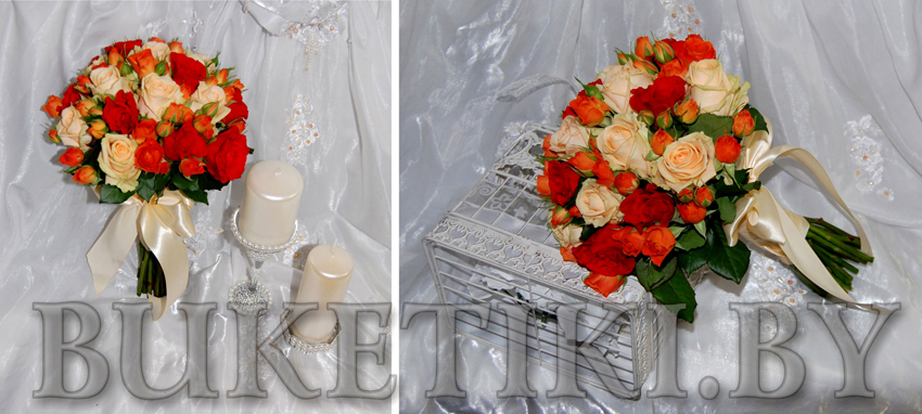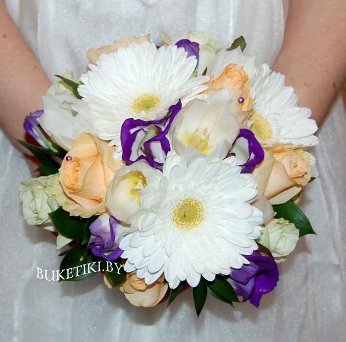 Осенний свадебный букет в состав которого входят розы двух видов, гербера, эустома, тюльпаны, зелень.