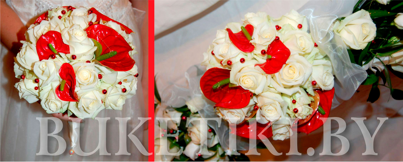 red&white Белая роза и красный антуриум. Драпировка ручки выполнена атласной лентой и жемчугом. В едином стиле с букетом сделана композиция на стол молодых, в центр которой ложится букет неветы.