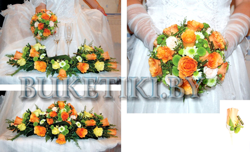 Роза 3-х сортов, хризантема 2-х видов, зелень. В составе композиции на стол молодых 2 в 1.
