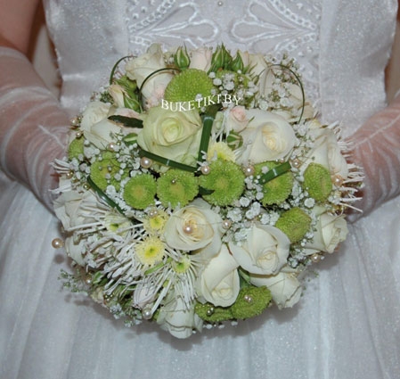 Бело-зеленая роза, кустовая роза, хризантема двух видов, гипсофила, берграс. Украшен жемчужинами. Составлен ассимитрично.