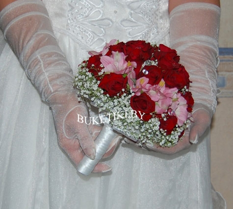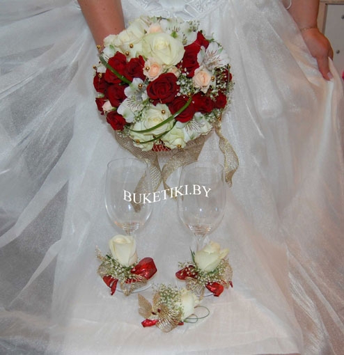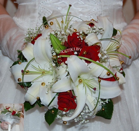 Лилия, красная роза, гипсофила, берграс. Драпировка ручки выполнена органзой и жемчужными шпильками. Букет украшен золотой проволокой и золотыми бусинами.
