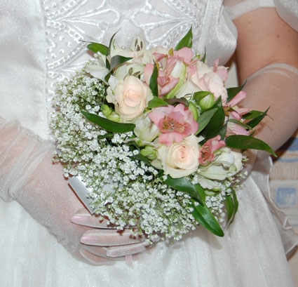 Лилия, роза, гипсофила, зелень. Драпировка руки выполнена белой атласной лентой.