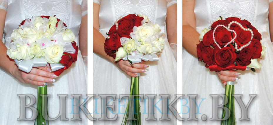 Букет в стиле "инь янь". Роза красная и белая, атласная лента, жемчужные бусины, берграс.