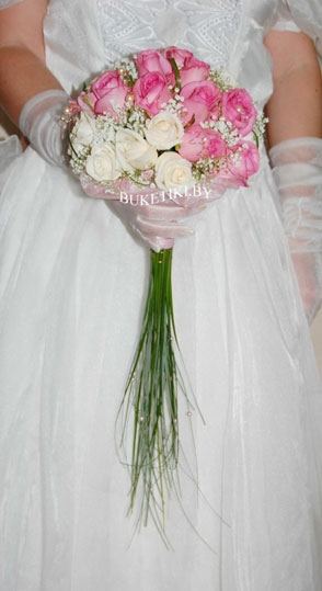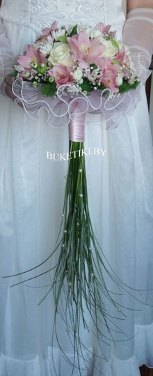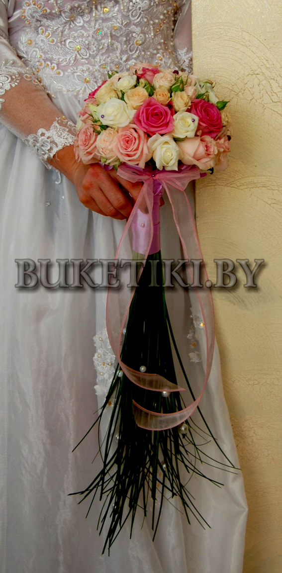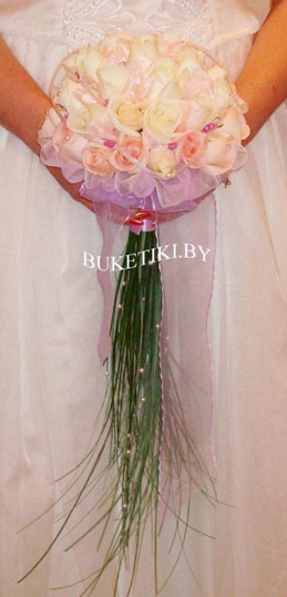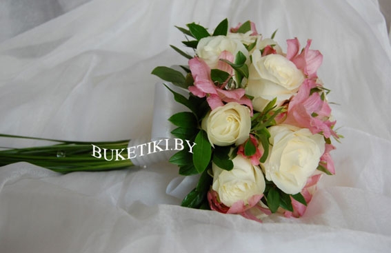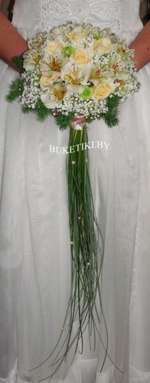 Три вида розы, альстромерия, гипсофила.Ручка драпирована органзой. Букет составлен ассимитрично.