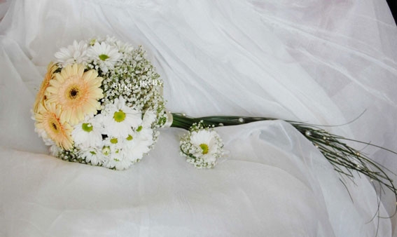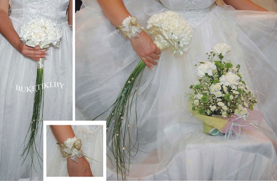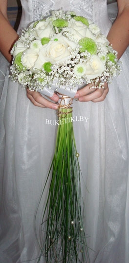 Белая роза, салатовая и белая хризантема, гипсофила. Драпировка берграссом, атласной лентой и жемчугом.