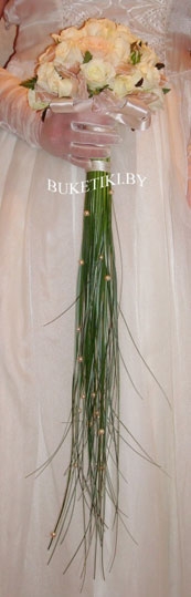Белая роза, кустовая кремовая роза, зелень. Вставками из шифоновой ленты. Драпировка берграссом, атласной лентой и жемчугом.