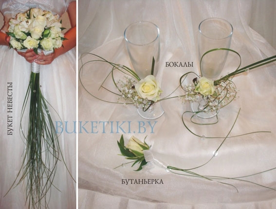 Белая роза, белая альстромерия. Драпировка берграссом, атласной лентой и жемчугом.