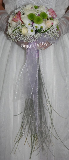 Роза, хризантема двух видов, гипсофила, берграс. Ручка драпирована атласной и шифоновой лентой. Украшен жемчужными бусинами. Букет составлен ассимитрично.