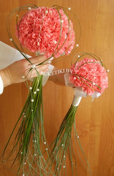 Персиковая роза, салатовая хризантема, кремовая альстромерия, гипсофила, зелень. Драпировка берграссом, атласной лентой и жемчугом.