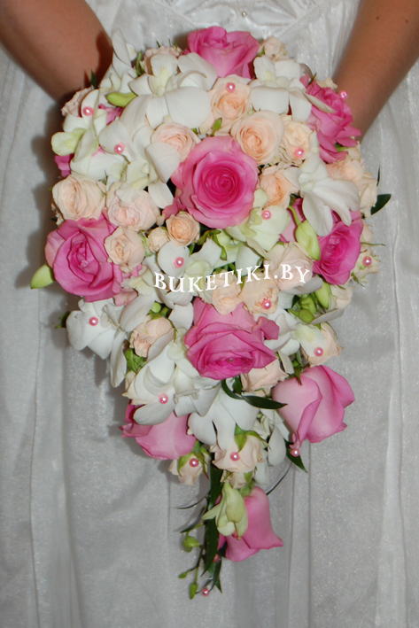 Роза нескольких видов, орхидея дендробиум, рускус, бусины.