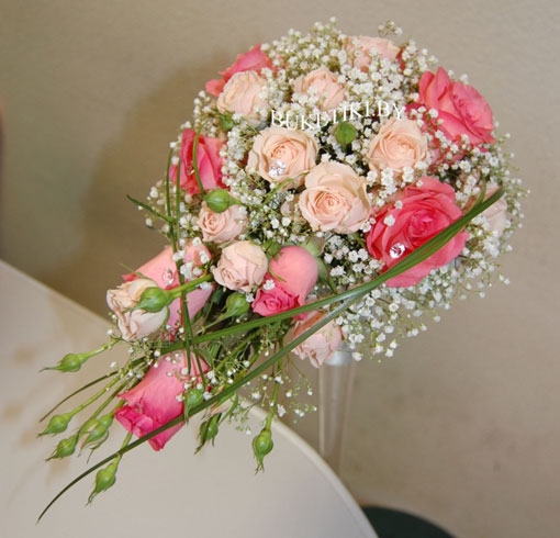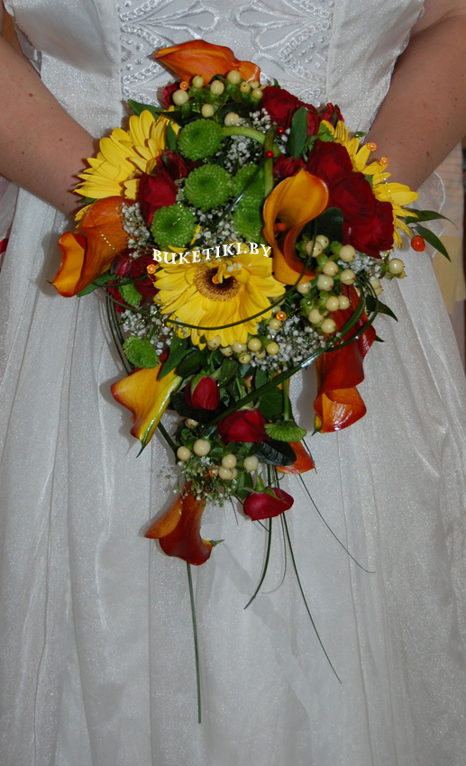 Розы, герберы, калы, гиперикум, хризантема, гипсофил, зелень, бусины. Полный фотоотчет расположен здесь.