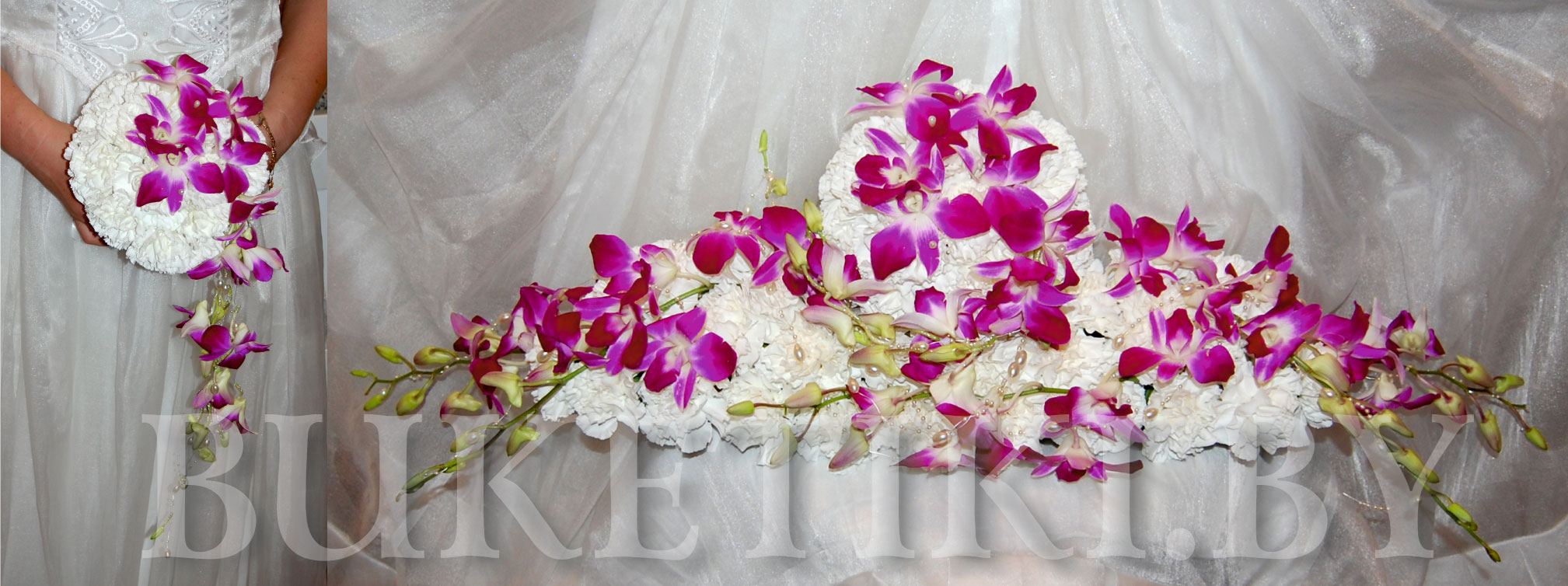 На белоснежной гвоздике цветки орхидеи дендробиум плюс композиция на стол невесты выполненная в стиле 2 в 1.